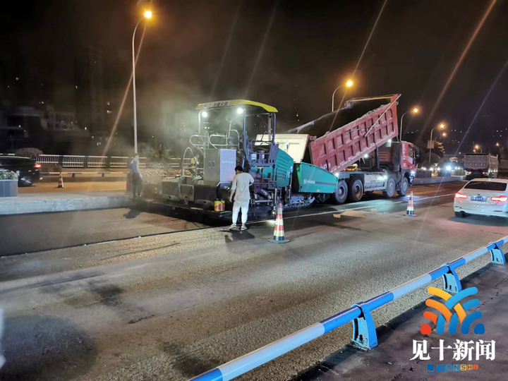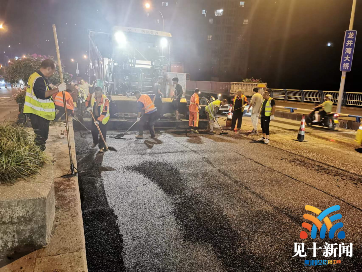 为避免影响市民车辆通行,针对龙井湾大桥铺路交通压力大、病害集中的特点,九龙坡区城市管理局市政处利用晚上10:00-凌晨6点集中机械设备维修队伍精干力量,迅速推进维修工程。采用每次封闭单向单车道、其余车道正常通行的方式完成桥面铣刨、修补、沥青摊铺及施划标线。此次施工整改历时4个夜晚,共完成“UTM”薄层罩面处理5700平方米。