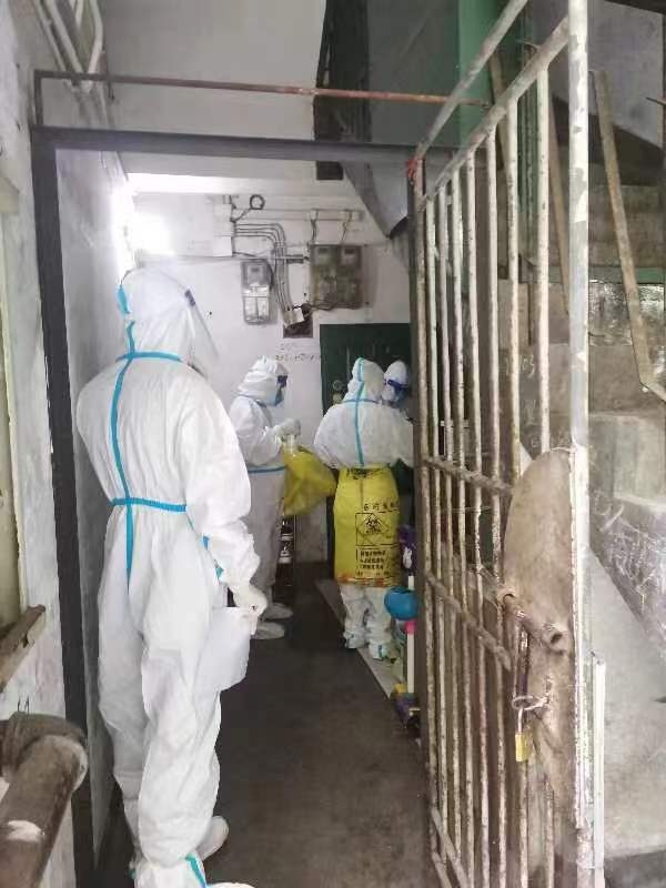 8月30日,石桥铺街道社区卫生服务中心医务人员进入九龙街道封控区老旧小区开展扫楼工作。