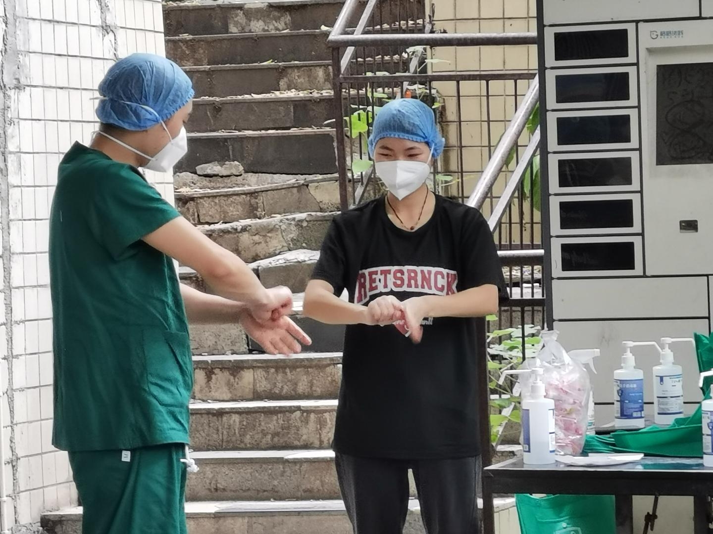 由区人民医院护士长邓德莉、李万勤,院感质控专家陈小莉组成的院感团队,规范实施医务人员核酸扫楼入户所有工作人员的操作培训,考核合格后上岗,并且严格在入户工作前、入户工作时、采样结束后等全流程监督指导,确保院感防控不留死角,医务人员应知应会,规范操作零感染。
