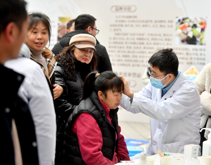 在中医适宜技术体验区,“中药穴位贴敷”“整骨疗法”“耳穴治疗”“中医药膏方饮品”“小儿推拿”……区中医院针灸康复科主任陈新胜团队为居民实施“耳穴治疗”,中医专家现场传授冬至养生秘籍。