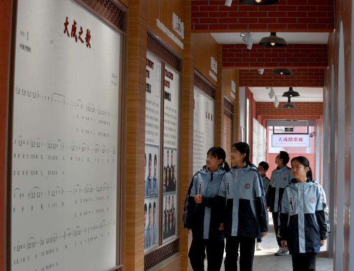 记者看到,杨家坪中学A区教学楼上的“大成”二字十分亮眼,该校区改扩建后将“大成”文化融入得更深。据介绍,近年来,杨家坪中学聚焦“大成”文化建设,以“人皆能大成”为集团校共同育人目的,以“六一”成就为现实路径,从找准学校文化的韵律节拍、激活学校文化的记忆基因入手,不断塑造学校特色文化品牌。该校的校园文化建设一直坚持“13455”大成文化模式:以“立德树人”为核心,“大成人物、大成场域、大成故事”为主要元素,以“民主渐进、情景交融、包容个性、继承创新”为构建特征,通过“大成精神文化、大成制度文化、大成环境文化、大成课程文化、大成行为文化”五个维度及“文化回溯”“文化提炼”“文化重构”“文化认同”“文化辐射”五大步骤,打造出具有辨识度的校园文化。这样的模式,在本次A区的校园文化建设中也得到了良好的印证和精美的呈现。