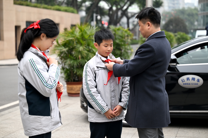 ▲川外九龙附小刘老师,正在为参会学生整理着装。 记者 王茂松 摄