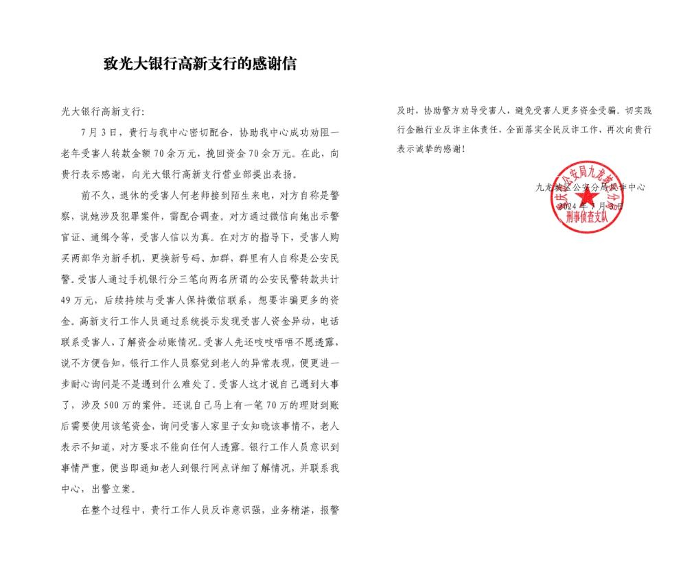 “假警察”?真陷阱! ——光大银行重庆高新支行成功拦截一起电信诈骗案件