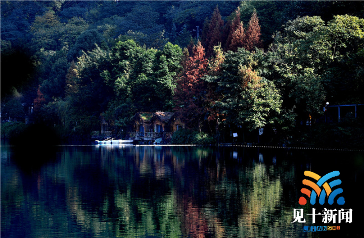 水杉和枫叶与晴天相遇 湖边倒影美如画