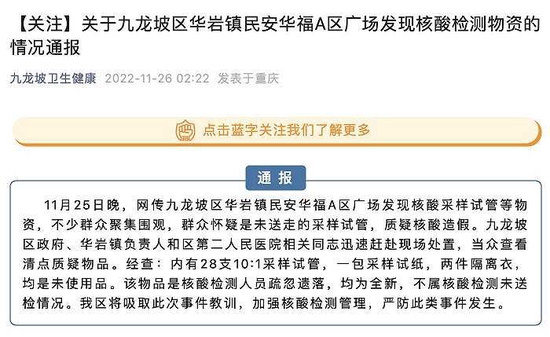 重庆九龙坡区通报一小区广场发现核酸检测物资:均是未使用品,不属未送检情况