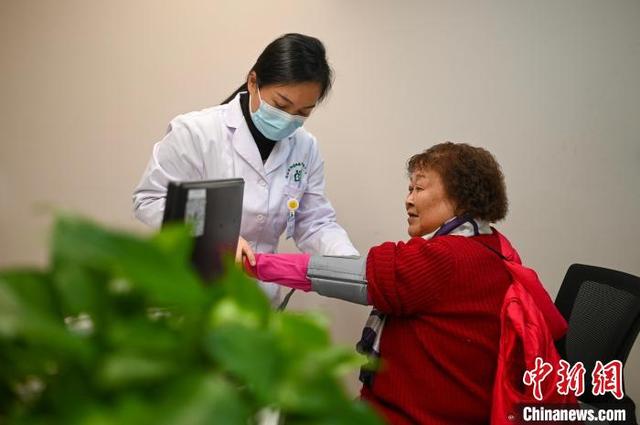 图为重庆75岁的民主村居民陈代蓉在卫生服务站内做检查。 中新社记者 何蓬磊 摄