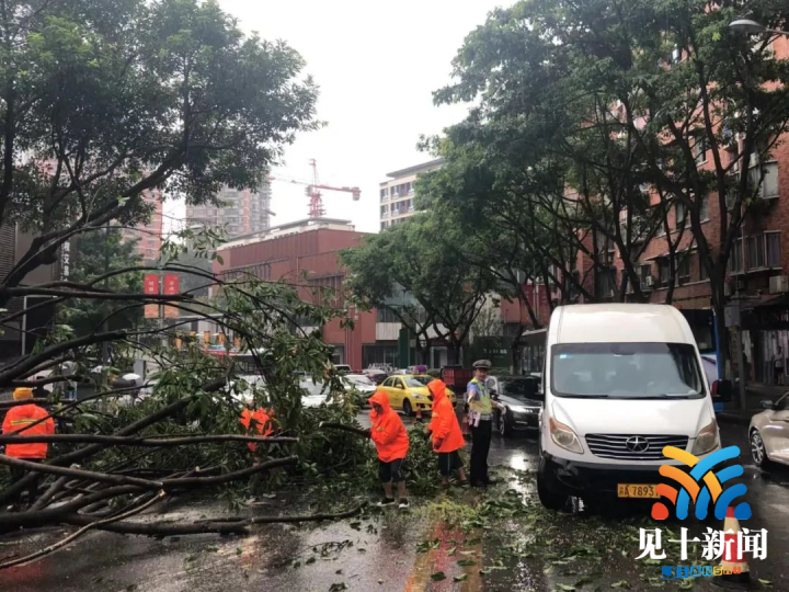 ▲9时许,杨九路重庆市第十三人民医院附近,一颗大树受大雨影响突然倒塌,正好砸上过路的车辆。交巡警杨家坪大队大队长吴兵正好巡逻至此,见状立即上前询问车上人员安全情况,经核实无人伤后便立即联系值班民警王伟和相关部门,共同开展抢险救援工作,经过快速处置,倒塌的大树枝叶被清除,不影响道路正常通行。