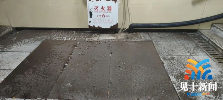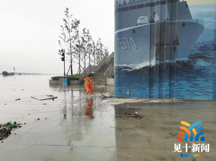 当日,在建设码头,倒灌的江水导致井盖喷出一层厚厚的淤泥,岸边的路面也被江水淹没,环卫工人站在污水中清理淤泥和堵塞的水篦子,让污水能顺畅排走。