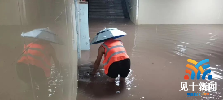 早上8时30分,记者在石桥铺老街印象地下通道看到,积水深度接近50公分,已渗透到人行阶梯上,市政抢险人员正卷起裤脚清理排水口堆积的树叶等垃圾,疏通排水管道,加大排水量。